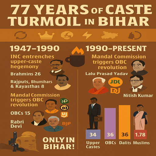 Over 77 years, Bihar’s politics has been a turbulent laboratory of caste dynamics 🔄, marked by dramatic reversals and enduring contradictions. From 1947 to 1990, the Indian National Congress (INC) entrenched upper-caste hegemony 👑: Brahmins alone ruled 26 years (34% of the total period), led by titans like Sri Krishna Sinha (13.5 years 🕰️) and Jagannath Mishra. Rajputs, Bhumihars, and Kayasthas added another 8 years, ensuring 80% of pre-Mandal rule came from just 15% of the population (upper castes). This Brahminical dominance collapsed overnight in 1990 with the Mandal Commission’s earthquake 🌍🔨, triggering an OBC revolution 🐂⚡. The Rashtriya Janata Dal (RJD), led by Lalu Prasad Yadav and his homemaker-turned-CM wife Rabri Devi 🏠→🏛️, leveraged Yadav muscle (15 years) to dismantle upper-caste monopoly, while Nitish Kumar’s Janata Dal (United) [JD(U)] harnessed Kurmi-Koeri unity for an unprecedented 19-year reign ⏳ – surpassing even the Soviet Union’s lifespan in proportional terms! Yet, this “social justice” wave masked stark paradoxes: OBCs (50% of Bihar) secured 36 years of power, barely double the upper castes’ 34, while marginalized Dalits (25% population) and Muslims (17%) remained footnotes 🚫, with just 2 years and 1.78 years of rule, respectively. Shockers abound: homemaker Rabri Devi ruled longer than Modi in Gujarat 🧑🍳👩💼, a Vaishya CM lasted 7 days ⏰ (shorter than a vacation!), and President’s Rule (4 years 🏛️⚖️) governed Muslims more than their own leaders. Even Mandal’s architect, Karpoori Thakur, ruled only 2.27 years but reshaped history 📜💥. Today, as the BJP revives upper-caste aspirations 🐘🔙, Bihar’s politics mirrors a caste carousel 🎠: Nitish Kumar allies with former foes, OBCs splinter into sub-castes, and Dalits remain tokens. The state’s journey – from Brahminical rule to Mandal upheaval to BJP’s Hindutva calculus – reveals a democracy where caste arithmetic ➗🎲 trumps development, and identities outlive ideologies. In Bihar, progress and stagnation coexist: a Dalit CM’s 0.76-year term is hailed as empowerment ✊, while 25% of its people wait for real inclusion. Here, history doesn’t move forward – it spirals in caste-colored circles 🌀. Only in Bihar! 🤯
